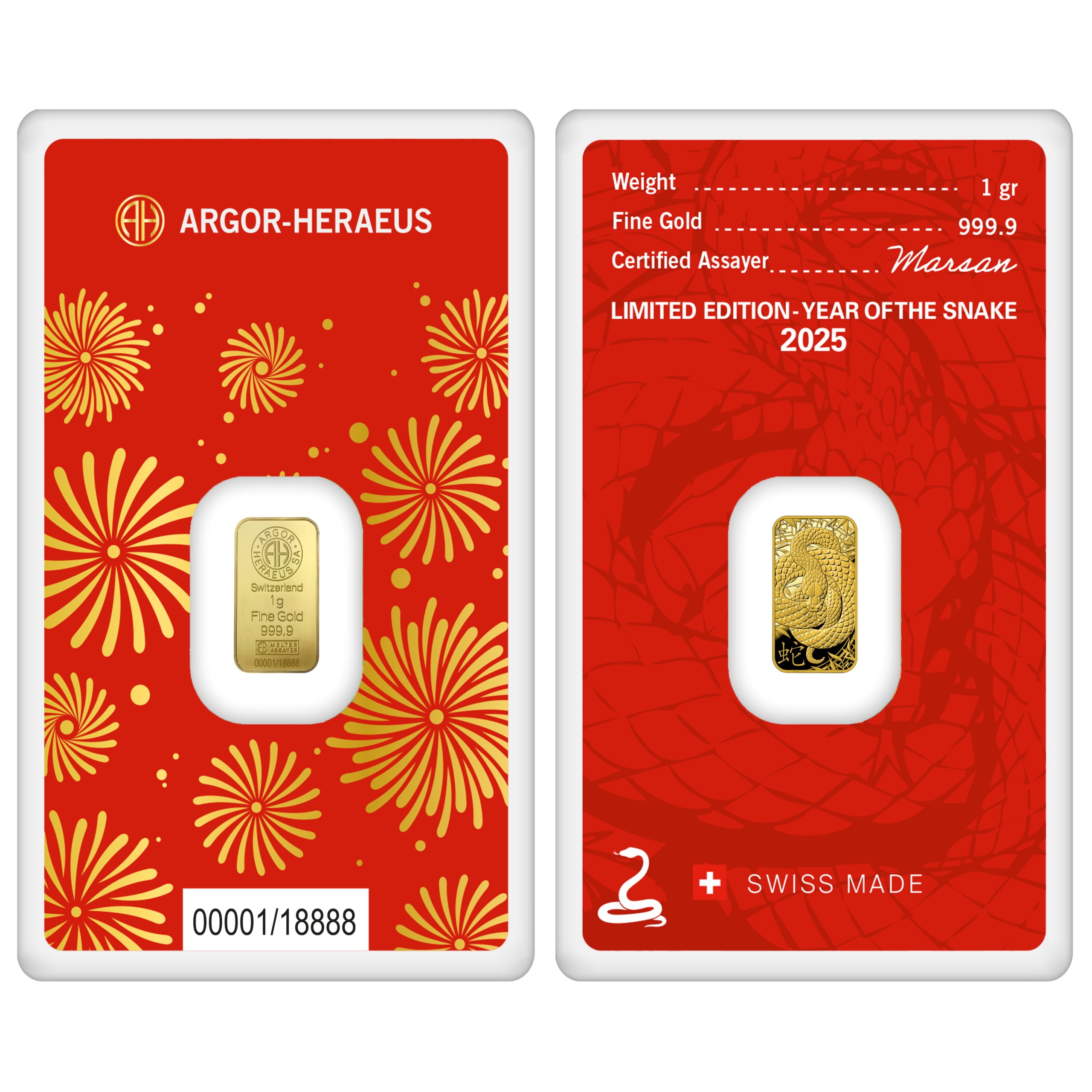 Celebra l’Anno del Serpente con il nostro lingotto d’oro da 1 grammo, parte della prestigiosa Serie Calendario Lunare di Argor-Heraeus. Questo lingotto è un omaggio all’intelligenza e all’eleganza del Serpente, simbolo zodiacale cinese di saggezza. Prodotto in edizione limitata a soli 18.888 pezzi, rappresenta una scelta raffinata per collezionisti ed estimatori.